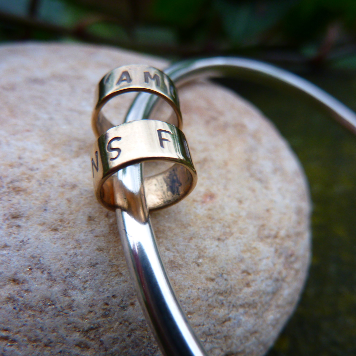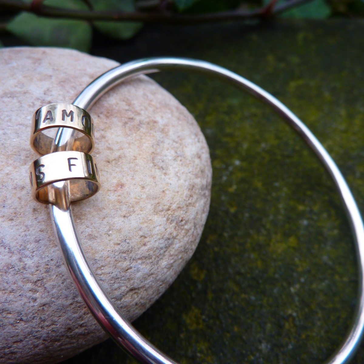 Contemporary solid silver handmade bangle, 3mm thick with freely moving handmade solid gold hoops – personalised for you.